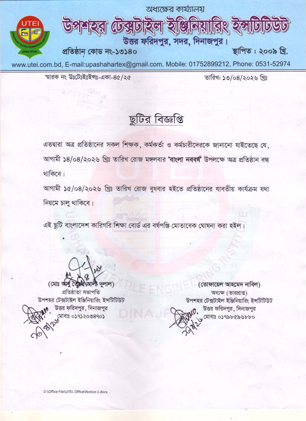 শুভ নববর্ষ উপলক্ষে পতিষ্ঠান বন্ধ থাকবে