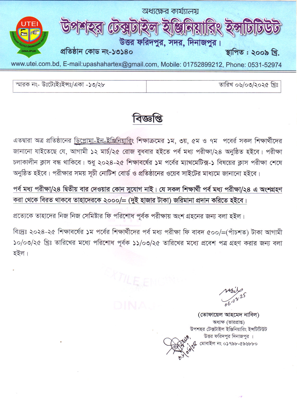 ১ম, ৩য়, ৫ম ও ৭ম পর্বের ডিপ্লোমা-ইন ইঞ্জিনিয়ারিং এর পর্ব মধ্য পরীক্ষা- ২০২৪