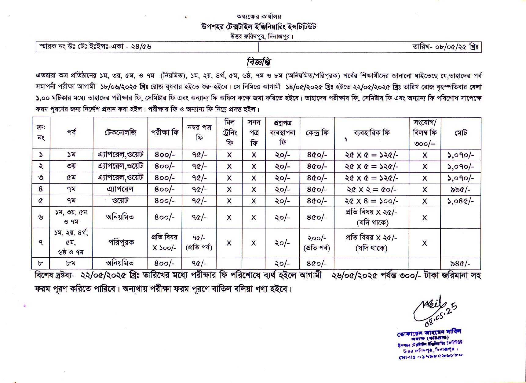 ডিপ্লোমা-ইন-টেক্সটাইল ইঞ্জিনিয়ারিং এর ১ম, ৩য়, ৫ম ও ৭ম পর্বের (নিয়মিত ও অনিয়মিত) সমাপনী পরীক্ষা-২০২৪ নোটিশ