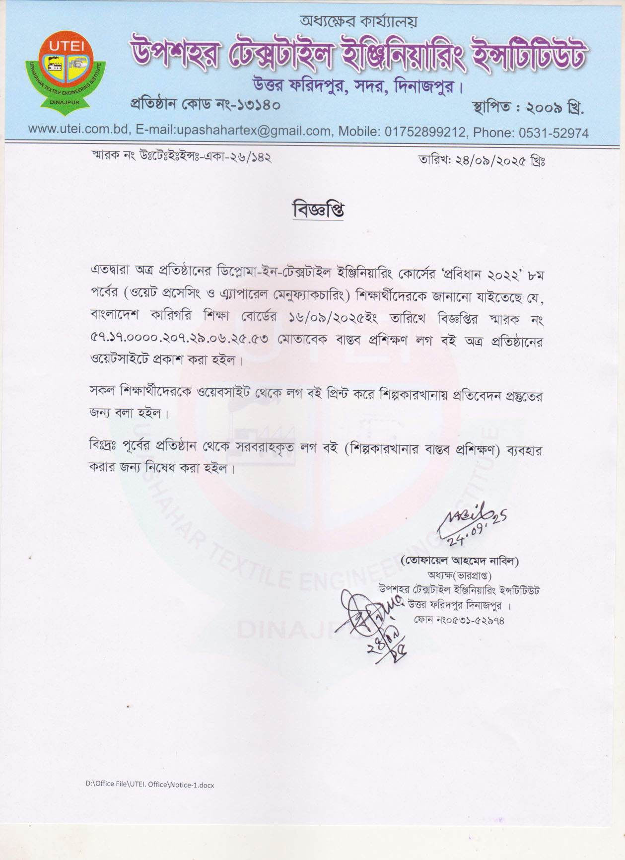 ডিপ্লোমা-ইন-টেক্সটাইল ইঞ্জিনিয়ারিং এর প্রবিধান-২০২২ এর লগ ইন বই সংগ্রহের বিজ্ঞপ্তি