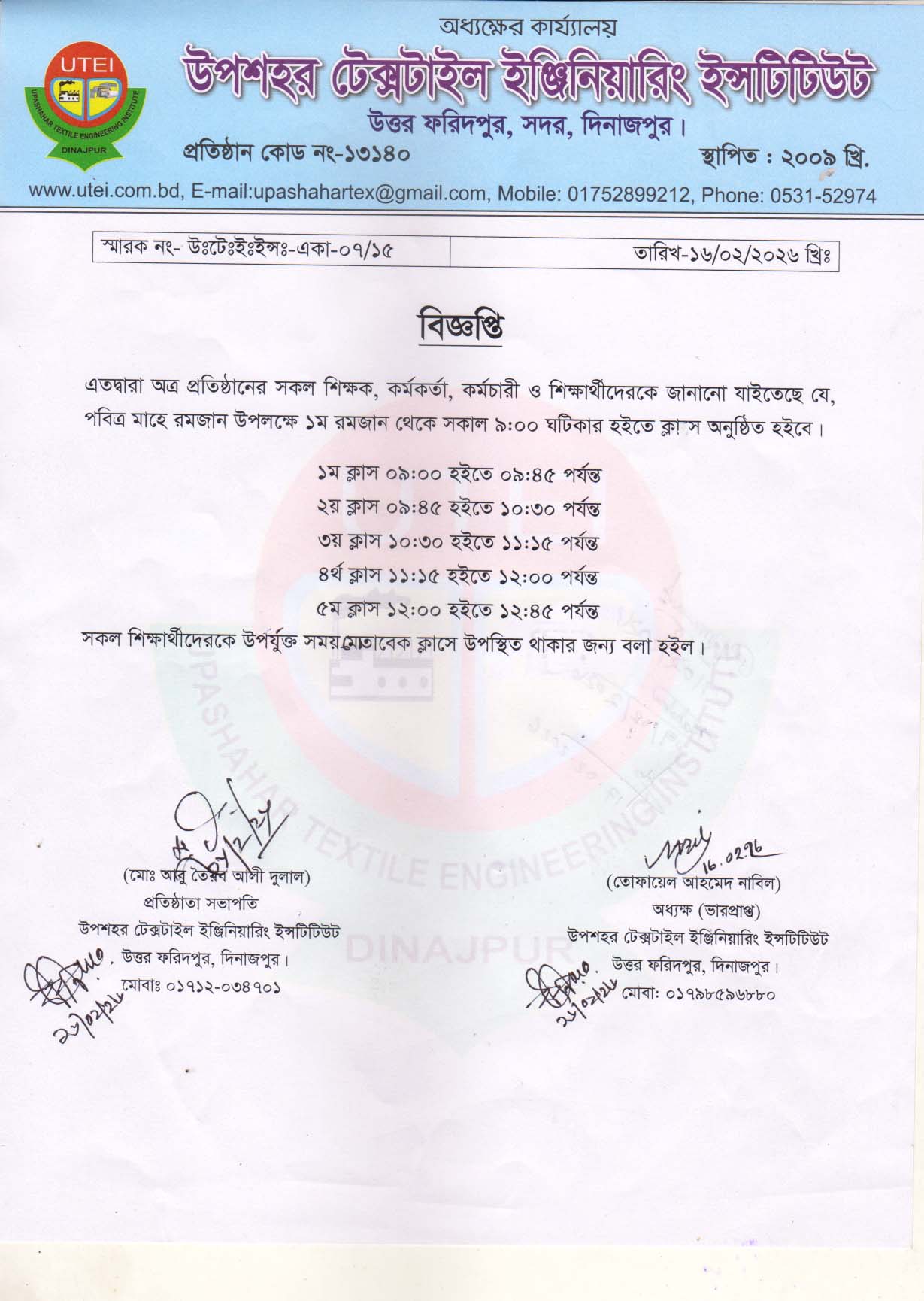 টেক্সটাইল ইঞ্জিনিয়ারিং এর ক্লাস রুটিন