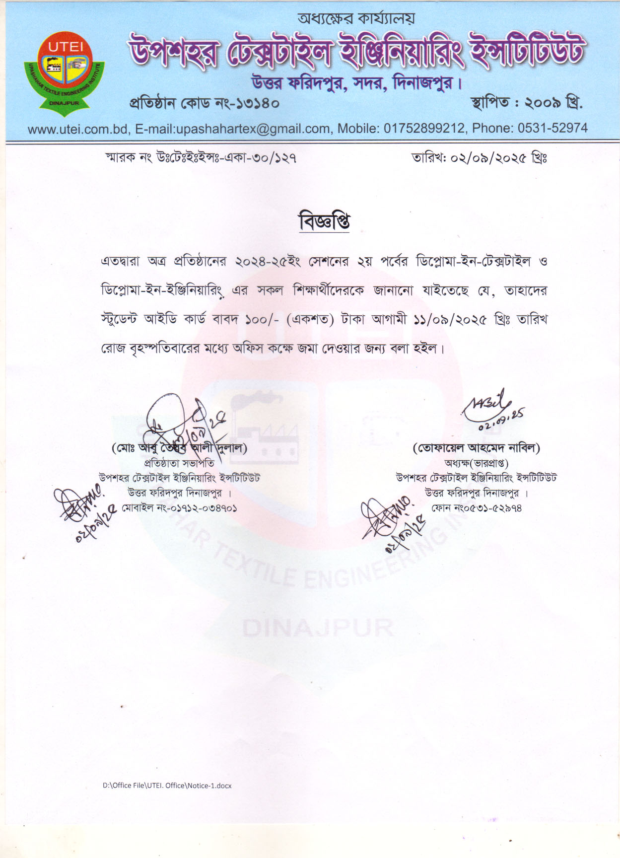 স্টুডেন্ট আইডি বাবাদ ১০০/- টাকা জমা প্রদান প্রসঙ্গে।
